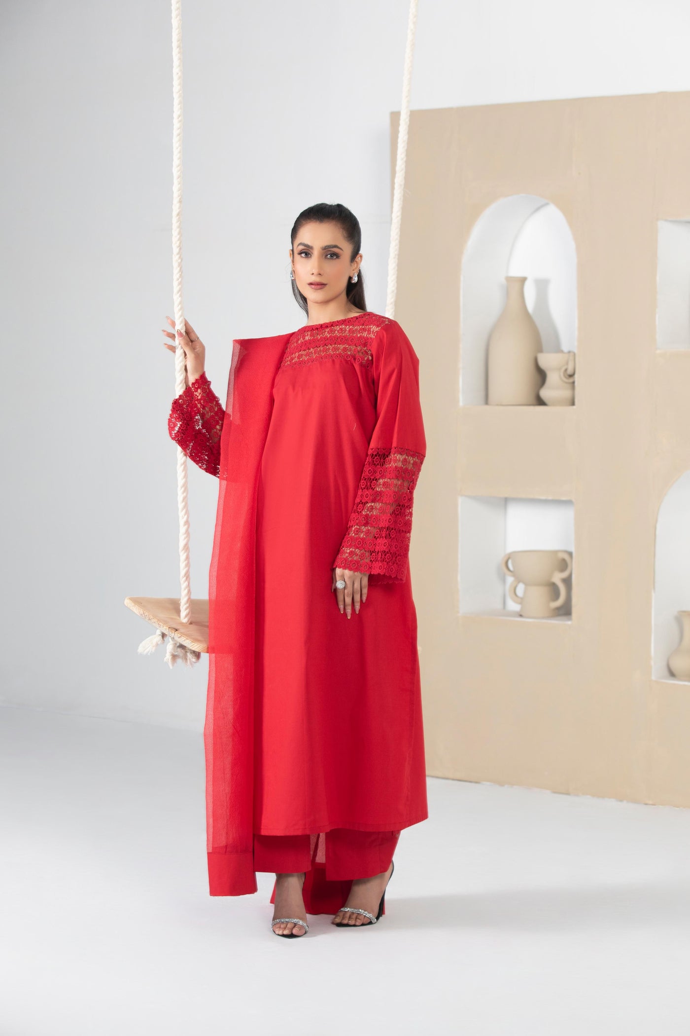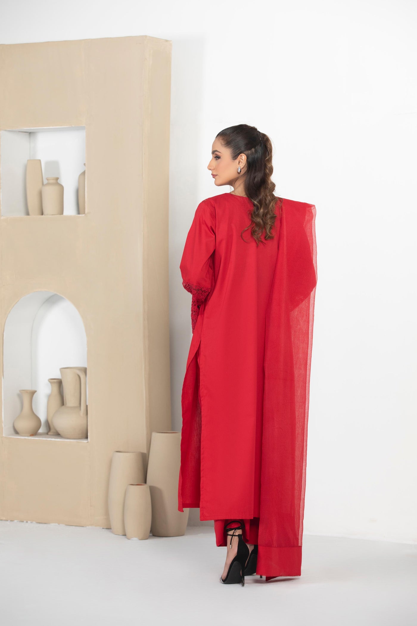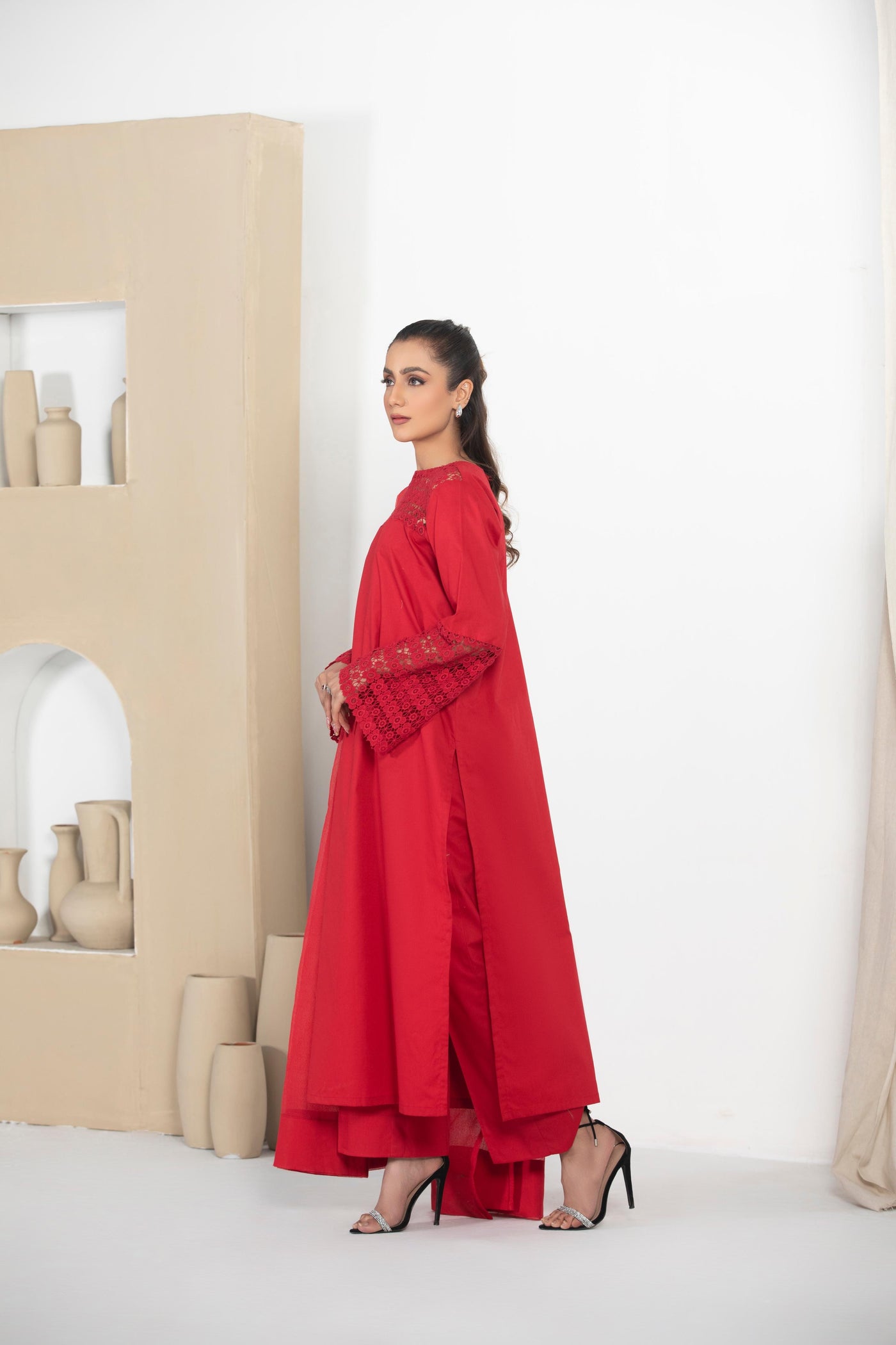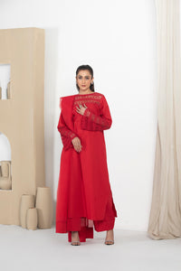 Drenched in a rich, passionate red, Lalarukh is a striking three-piece ensemble that embodies grace and sophistication. Featuring a long, flowing shirt designed for regal elegance, this outfit is a perfect blend of tradition and contemporary style. The bold hue symbolizes strength and beauty, making it an exquisite choice for festive celebrations and special occasions.