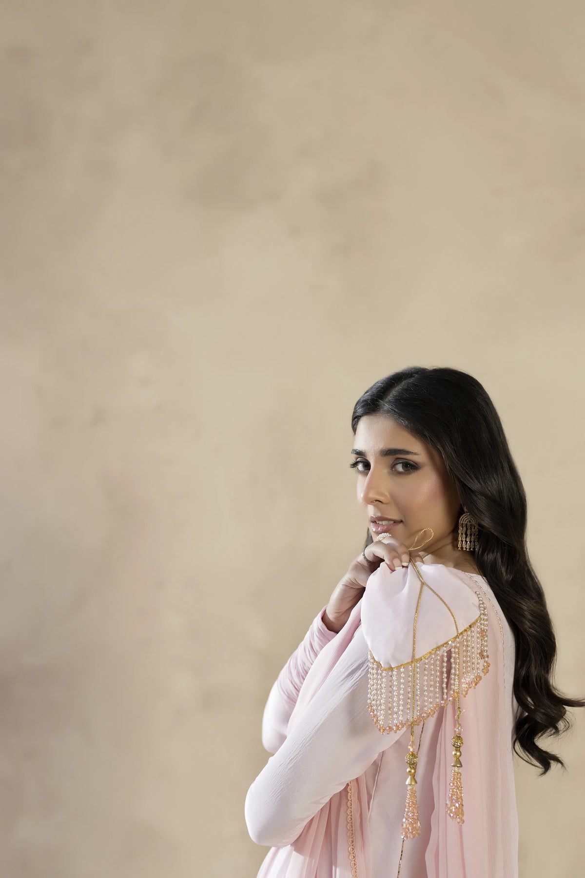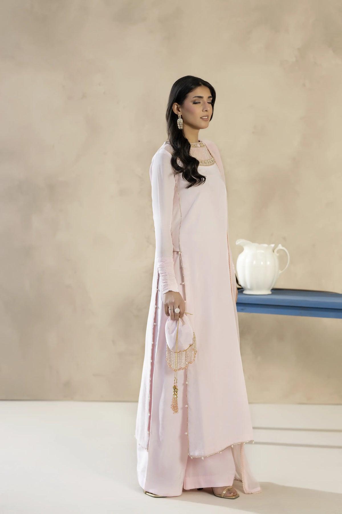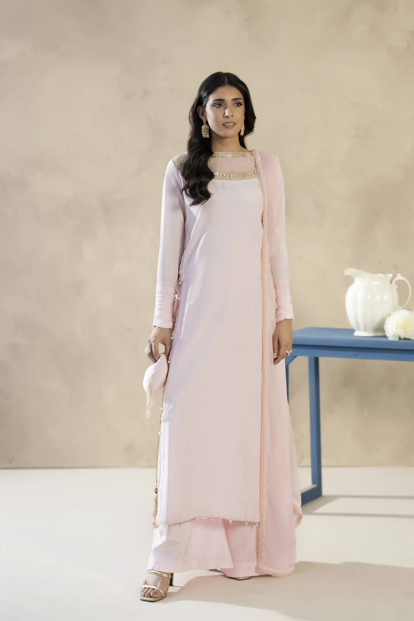 A soft powder pink tassel silk ensemble featuring an elegant Ada-work neckline. Paired with statement flared trousers and a delicate chiffon dupatta, this outfit reflects graceful femininity and modern sophistication.