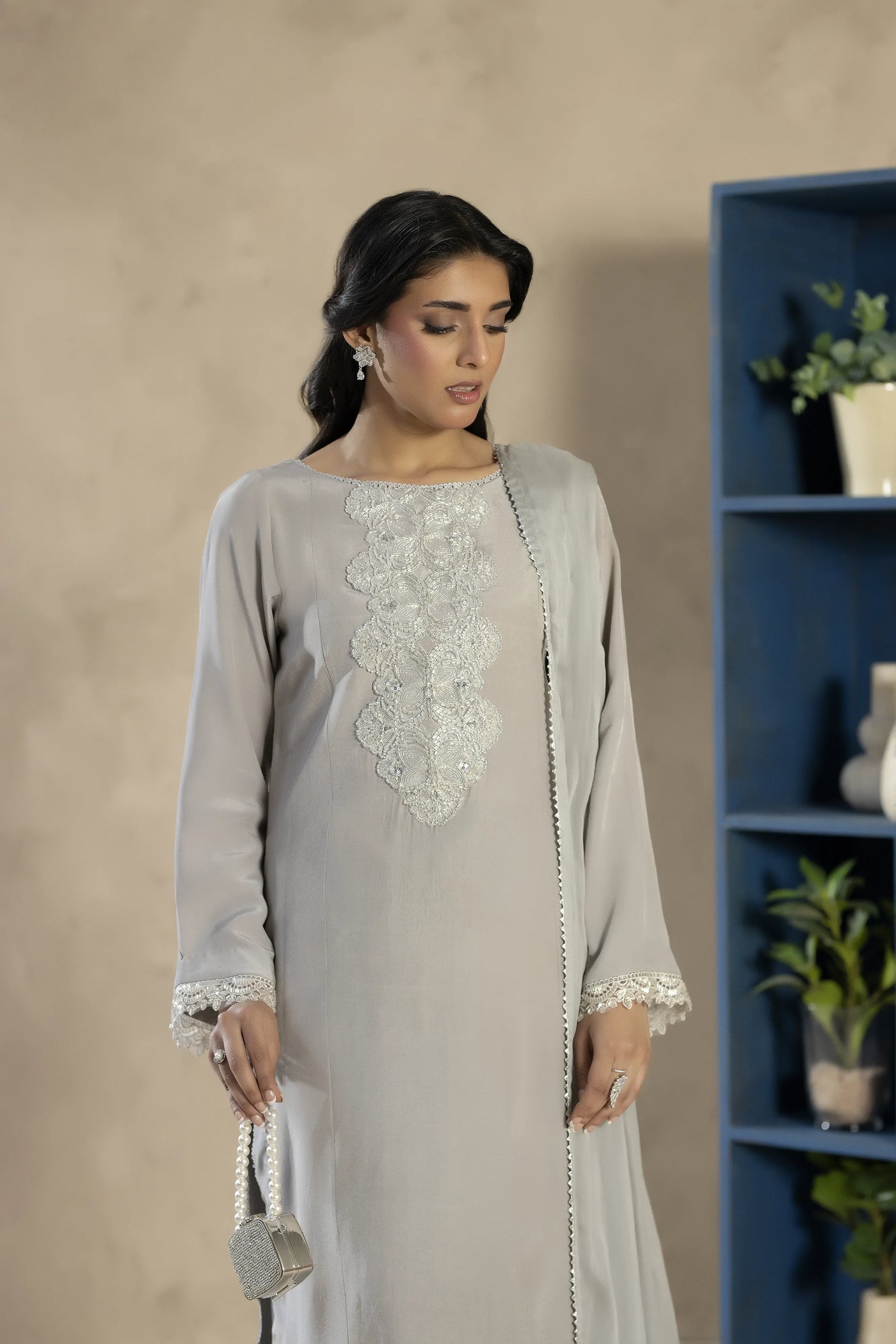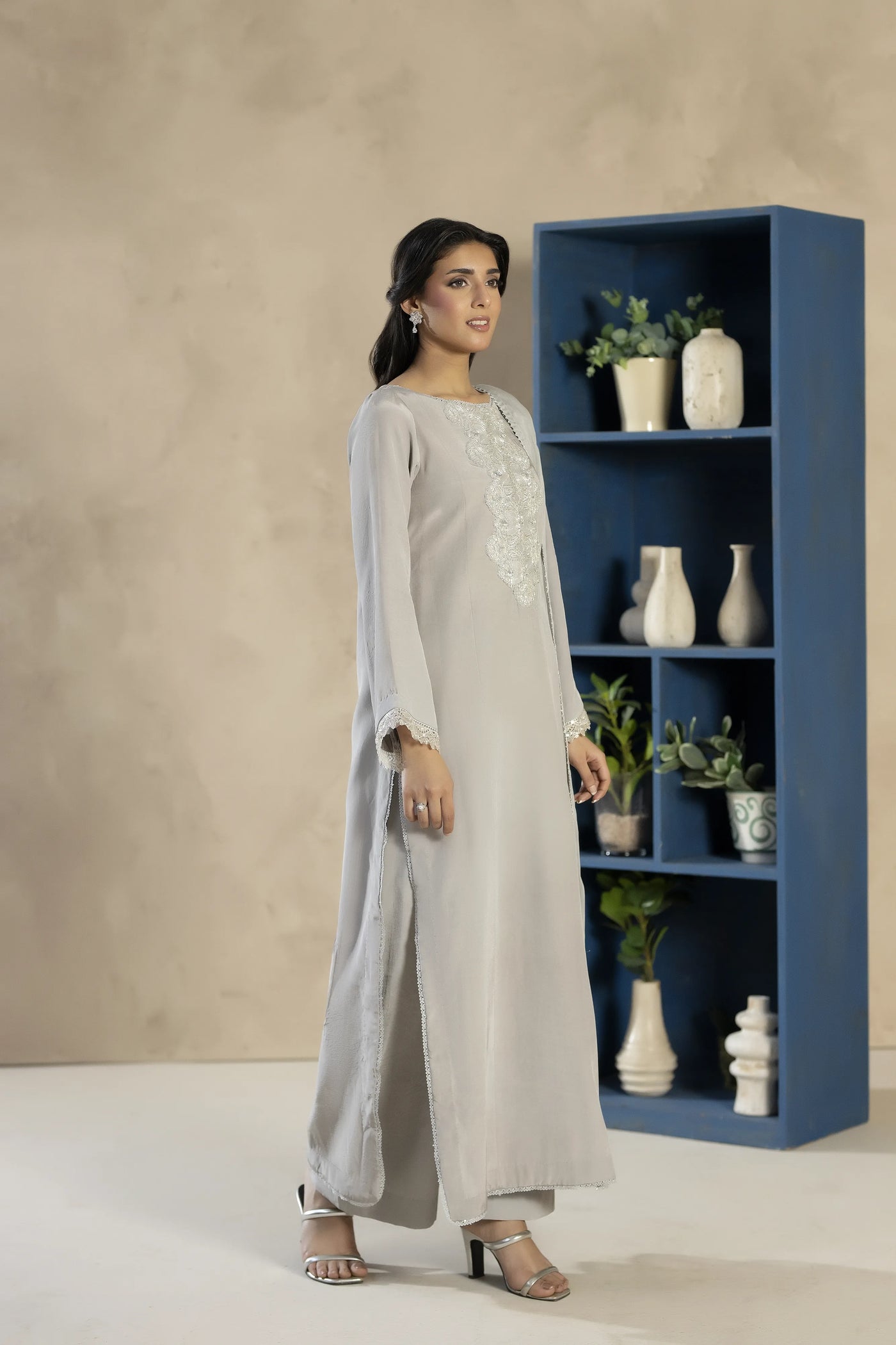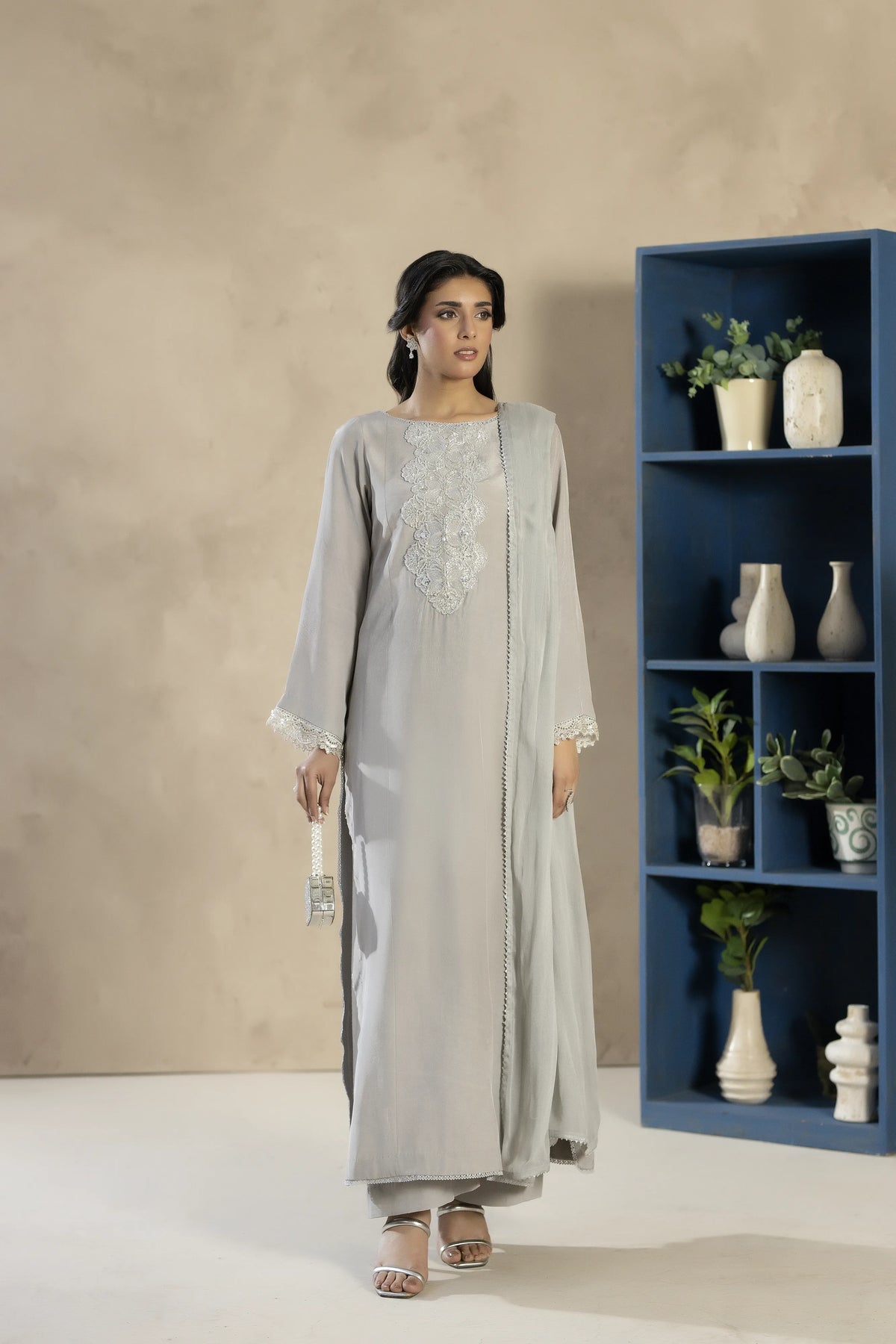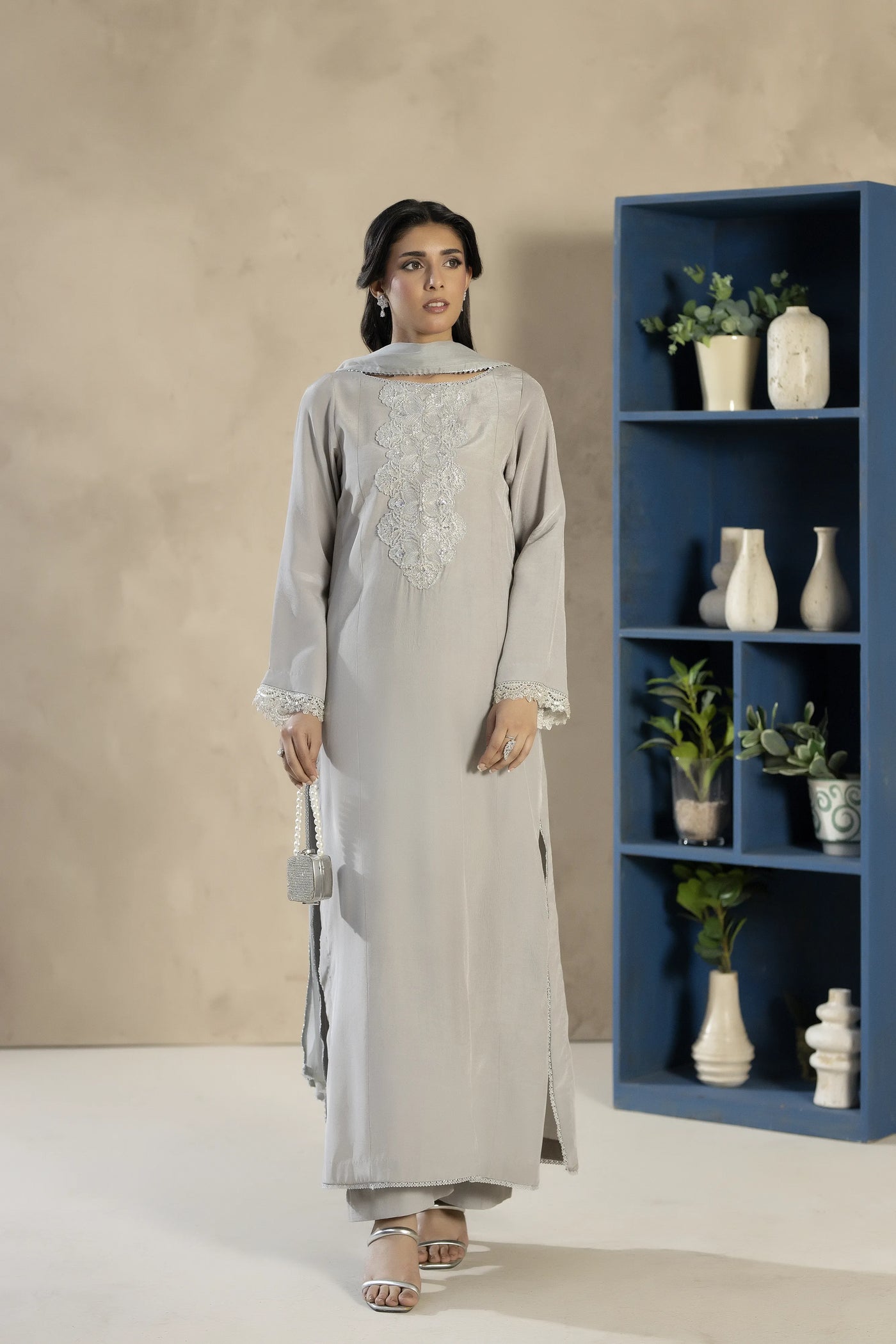 An elegant grey tassel silk outfit featuring subtle embellishments and a refined silhouette. Paired with matching trousers and a lightweight chiffon dupatta, this ensemble offers timeless sophistication.