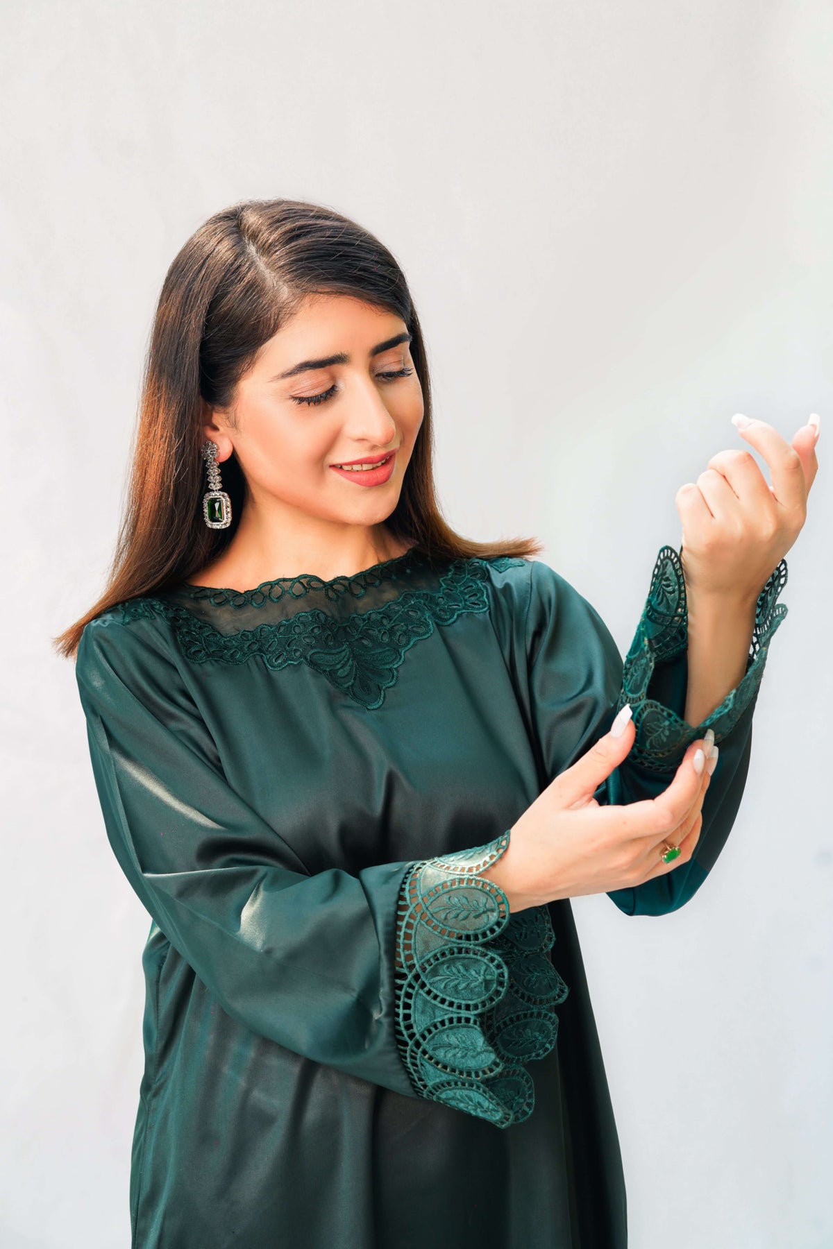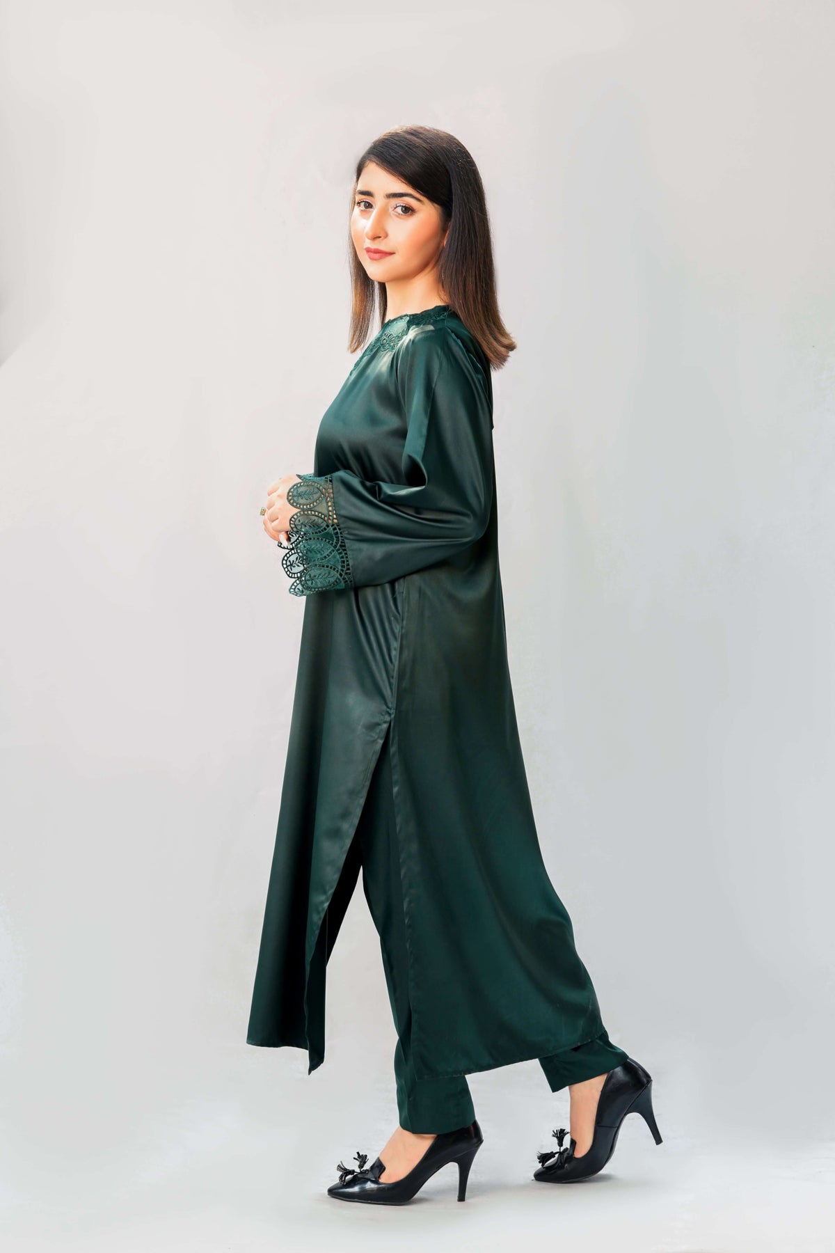 The Emerald Flow ensemble is a stunning expression of elegance and sophistication, perfect for any occasion. This exquisite long shirt is crafted from luxurious satin silk in a rich bottle green hue, creating a timeless appeal. The neckline is adorned with beautifully designed organza patches and intricate embroidery, elevating the overall aesthetic. Paired with slightly narrow capri or trouser bottoms, this outfit effortlessly combines traditional charm with contemporary style.