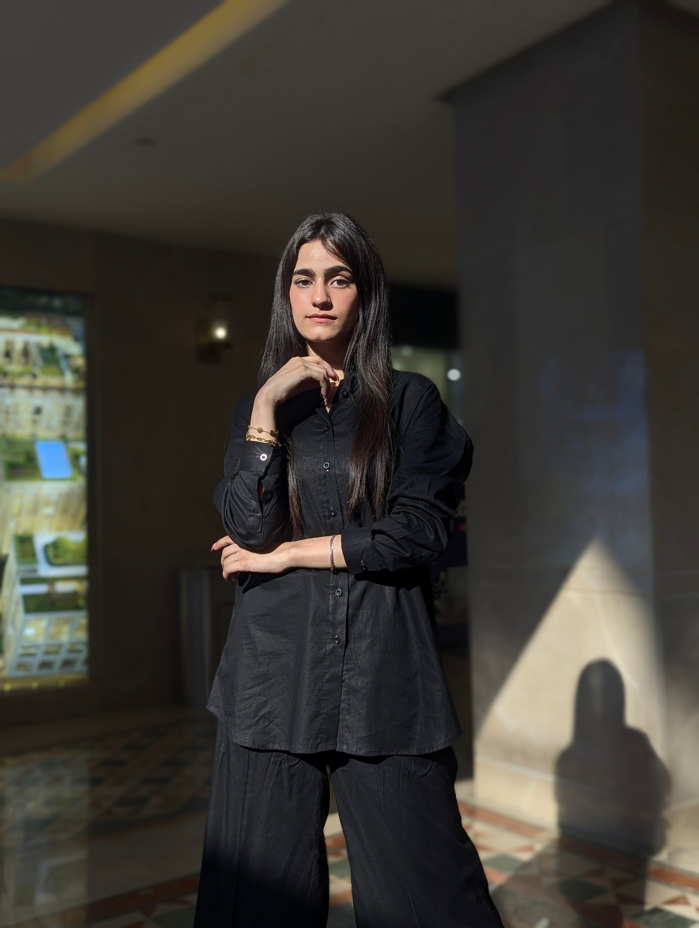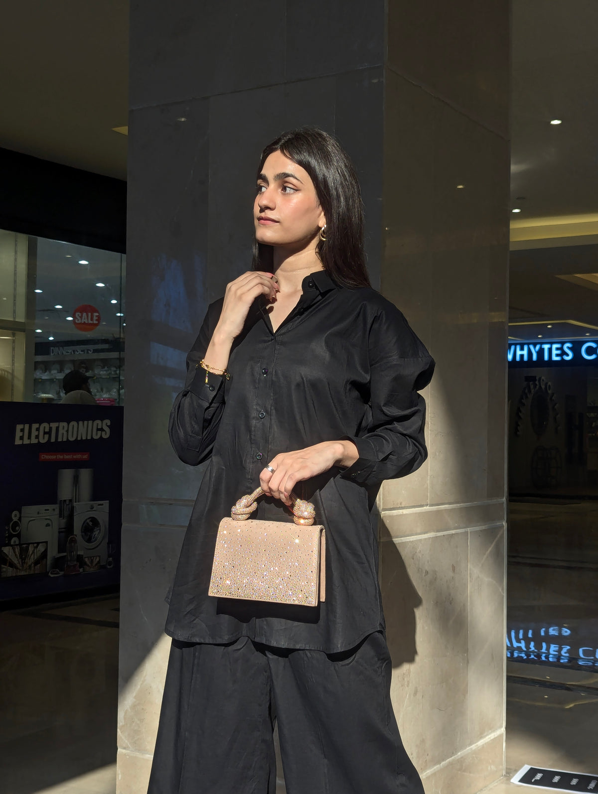 A sophisticated black stitched coord set featuring trendy cuts and a flattering fit, perfect for a chic and stylish look.